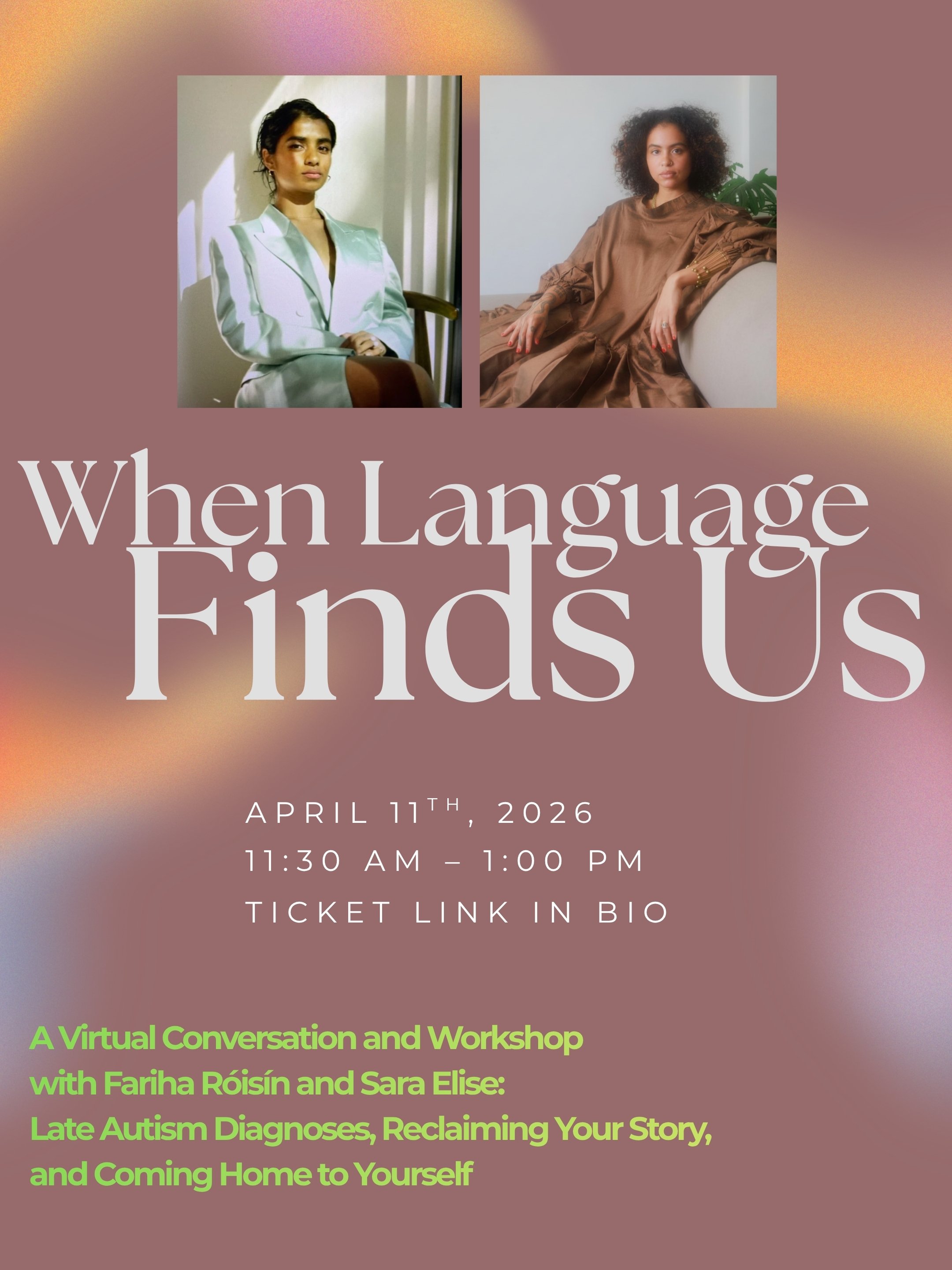 Fariha Róisín and Sara Elise are coming together for an intimate conversation on their late autism diagnoses— the grief, the relief, the reframing— to share their stories on how navigating autism has been in a world that limits and misunderstands neurodivergent people.